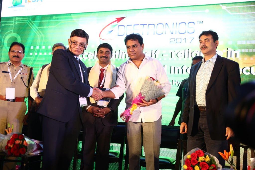 Finally, let me round up this post with an exhilerating note – the opportunity to share the dais with Hon’ble Dr BVR Mohan Reddy of Cyient – and Deftronics Lifetime awardee…and our photograph from the felicitation ceremony…