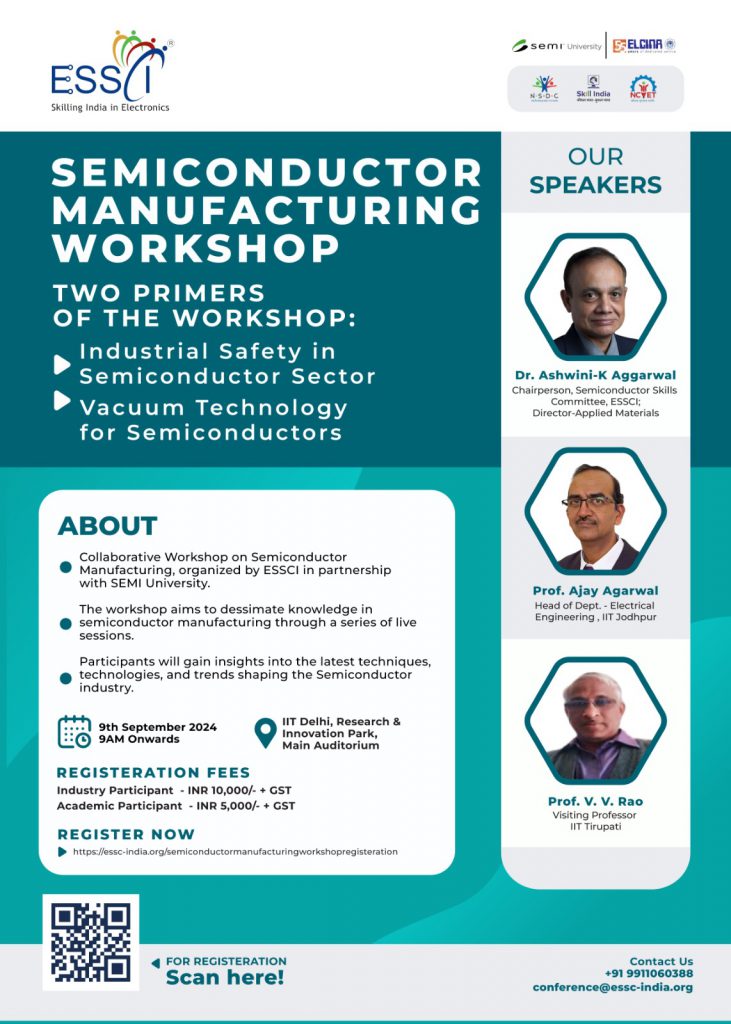 Privileged to coordinate the SEMI-ESSCI Tutorials on Semiconductor Manufacturing. Designed as a primer for the NCVET approved NOS /AICTE approved curriculum, the program will be held on 9th September 2024 in the SEMICON India week at IIT Delhi Research & Innovation Park.