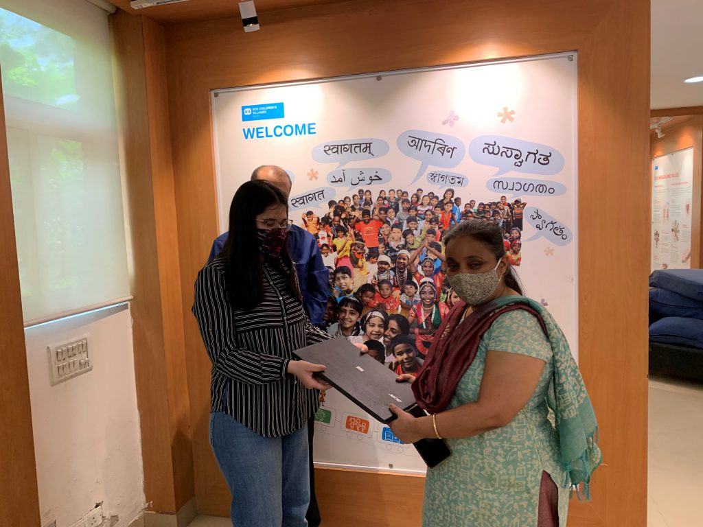 In the photograph below: SOS champion Lavanya donates the laptop for SOS village children while proud father (Amit ji watches) – the SOS volunteers are maintaining social distance while being mentally aligned!